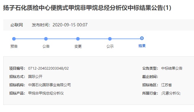2020年9月15日揚子石化質檢中心便攜式甲烷非甲烷總烴分析儀中標結果公示,招標人:中國石化國際事業有限公司,項目編號為:0712-204022003048/02。